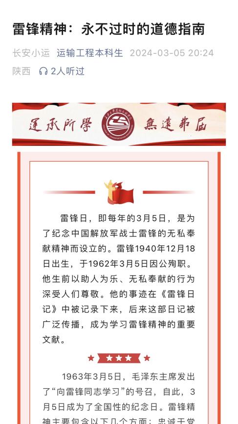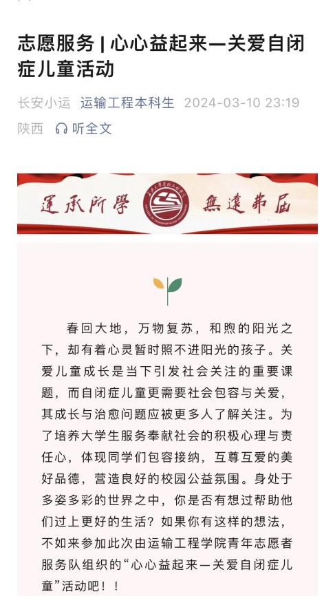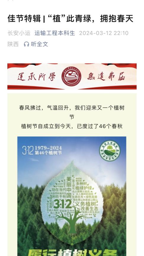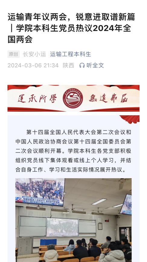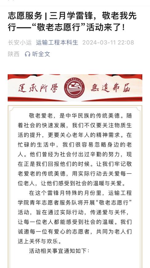 无码a片 牢牢把握网络思政教育阵地,在两会、学雷锋日、植树节等重要时间节点,“运输工程本科生”公众号推出“学两会”、“佳节特辑—植树节”特色栏目,并围绕“学雷锋月”志愿服务活动安排,开展“敬老志愿行”、“心心益起来”志愿服务招募活动,润物无声地将社会主义核心价值观、大学精神、科学成才观浸润到学生心田,引导学生厚植家国情怀、将小我融入大我,不断践行强国有我的成才目标。